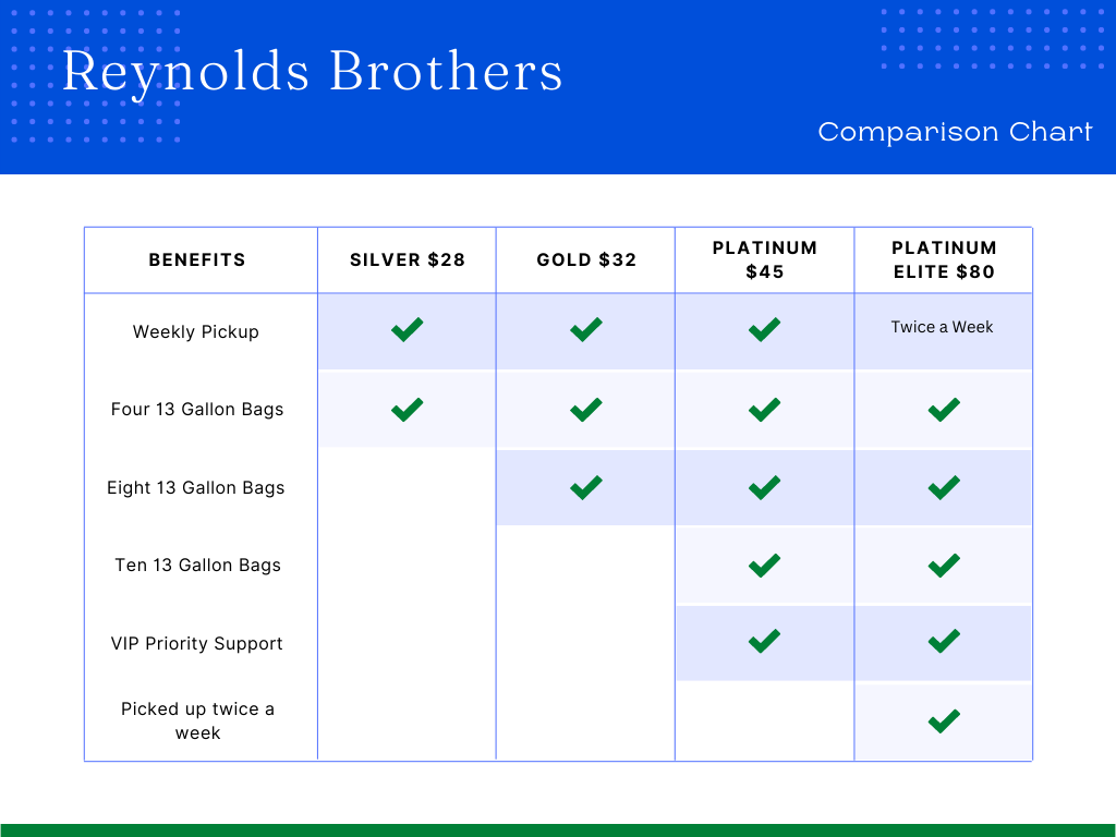 Switch to the Reynolds Brothers Platinum Elite Plan and we'll pickup your garbage twice a week!